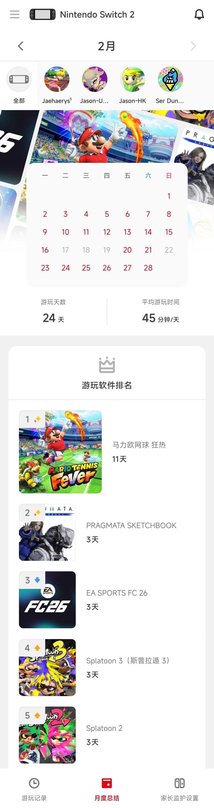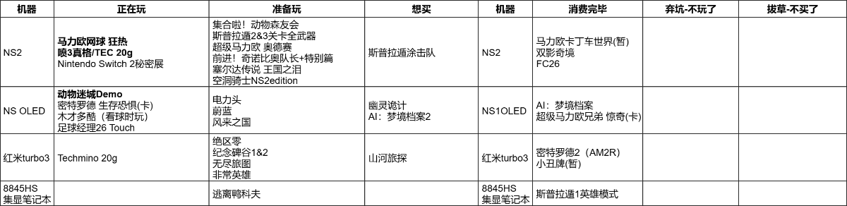 FC26(4h30min):EA在游戏设置菜单里很贴心地添加了一个“游戏时长”的功能,大概是想帮助玩家合理管理游戏时间。but我用NS2玩,根本就不会退回到主菜单,每次都是直接休眠,唤醒直接玩。导致完全忘记时间,不知不觉就花费了过多时间。结论:不要用掌机玩足球游戏。还好,本月初就紧急把这张钥匙卡还回去了。