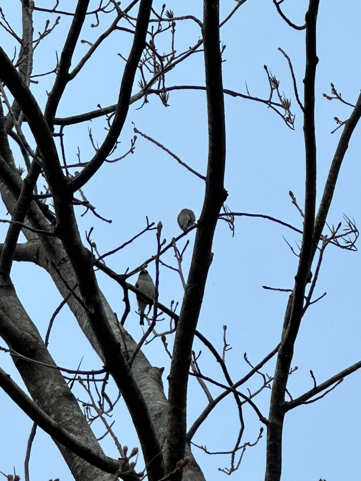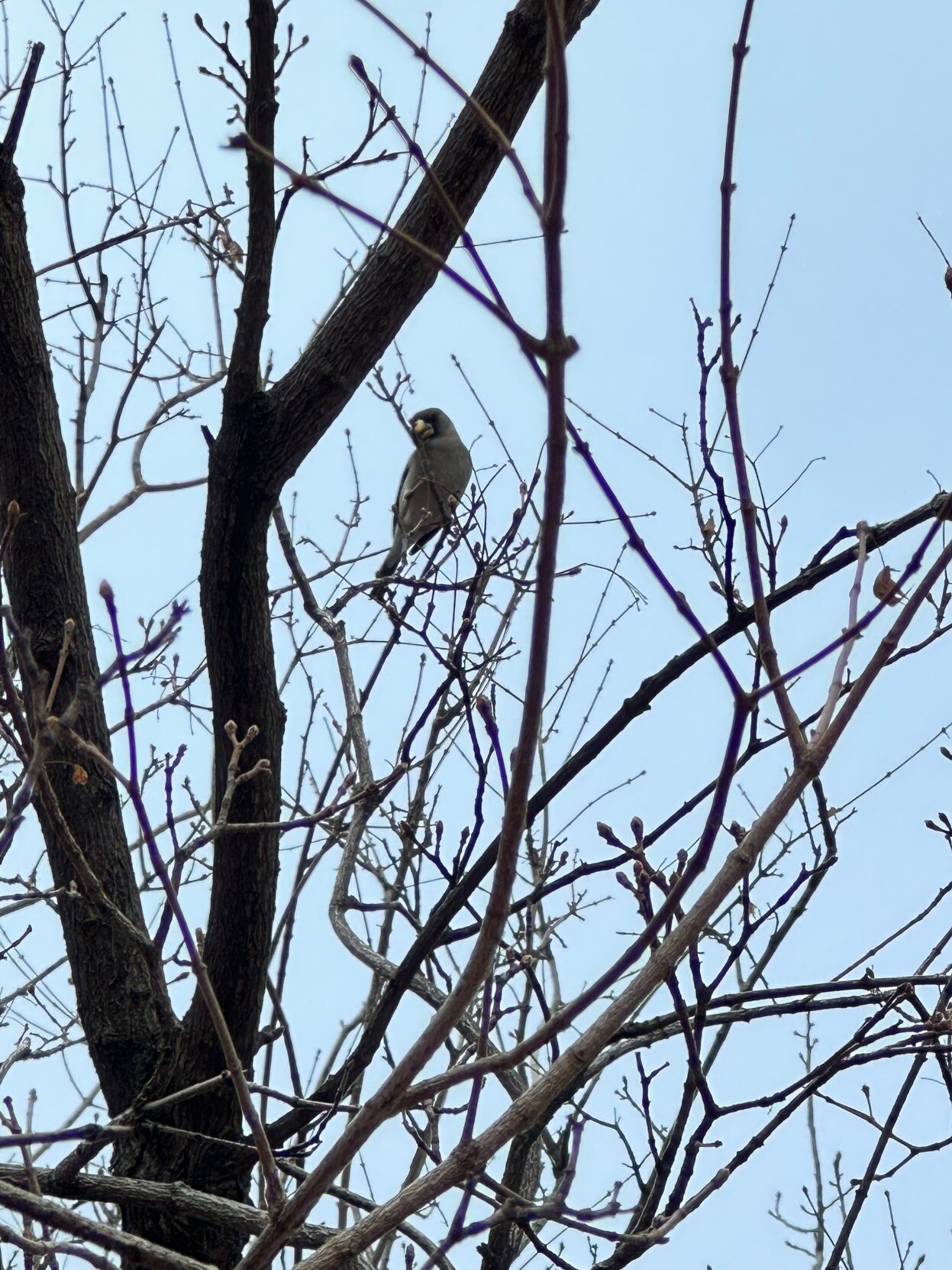 停车场后面的树上观到鸟了,叫声很好听,是黑尾蜡嘴雀吗? :cdko_thinking_face: