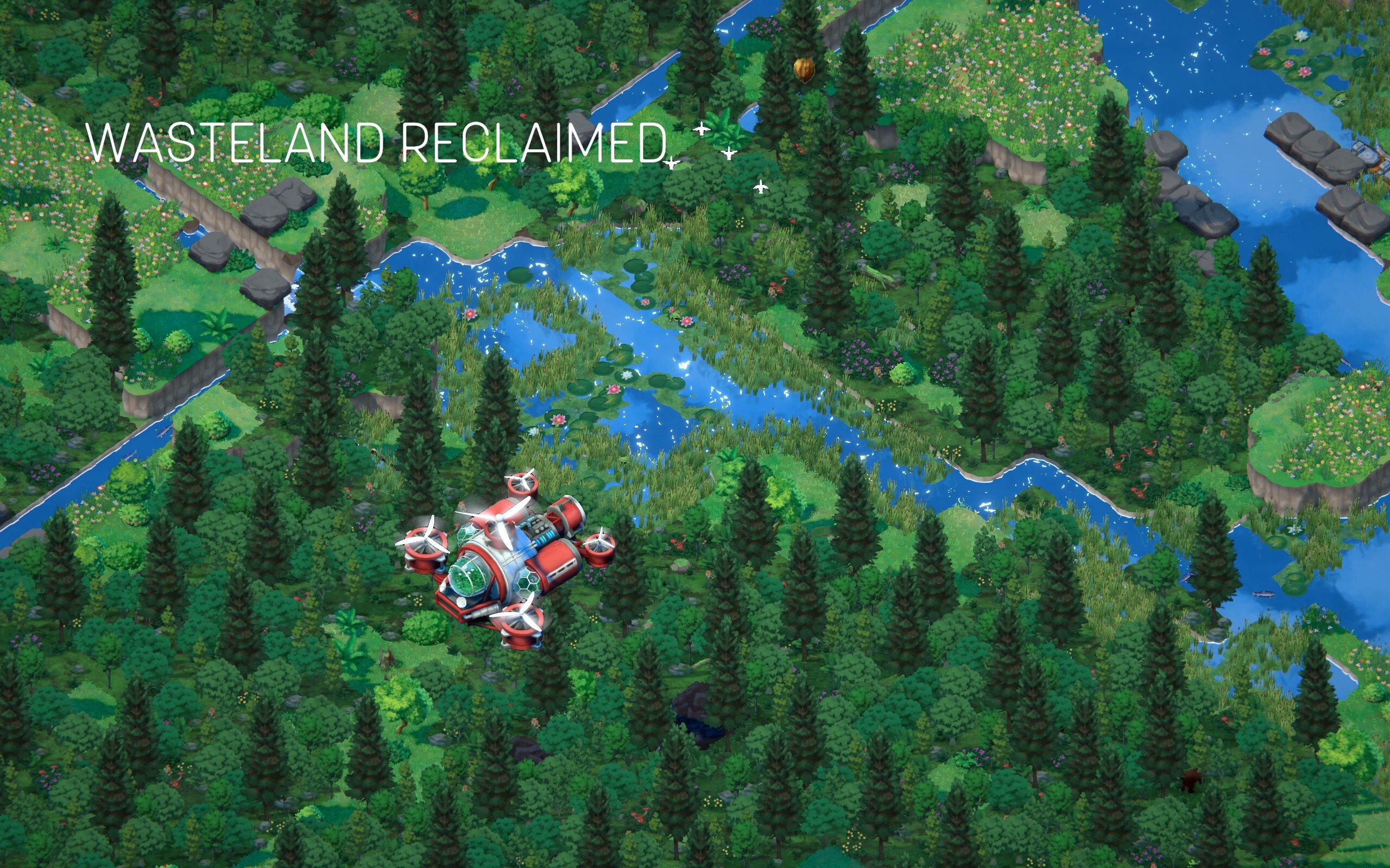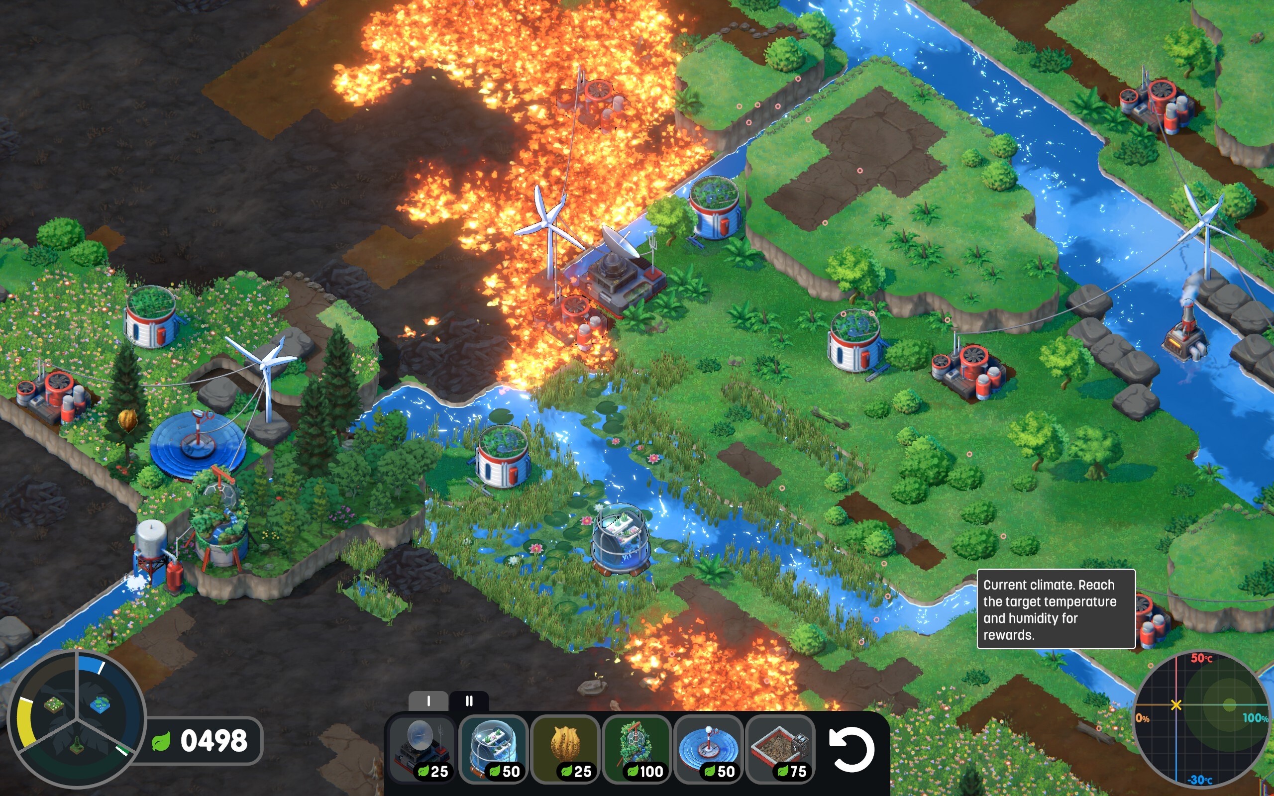 玩法是建造电厂、自动灌溉器等等的设施把荒漠改造成绿地,达成一定改造目标后可以改造出湿地、绿林,最后把温度和湿度调节到目标范围(通过人工降雨等),再回收之前的所有设施让整个环境回归自然生态。