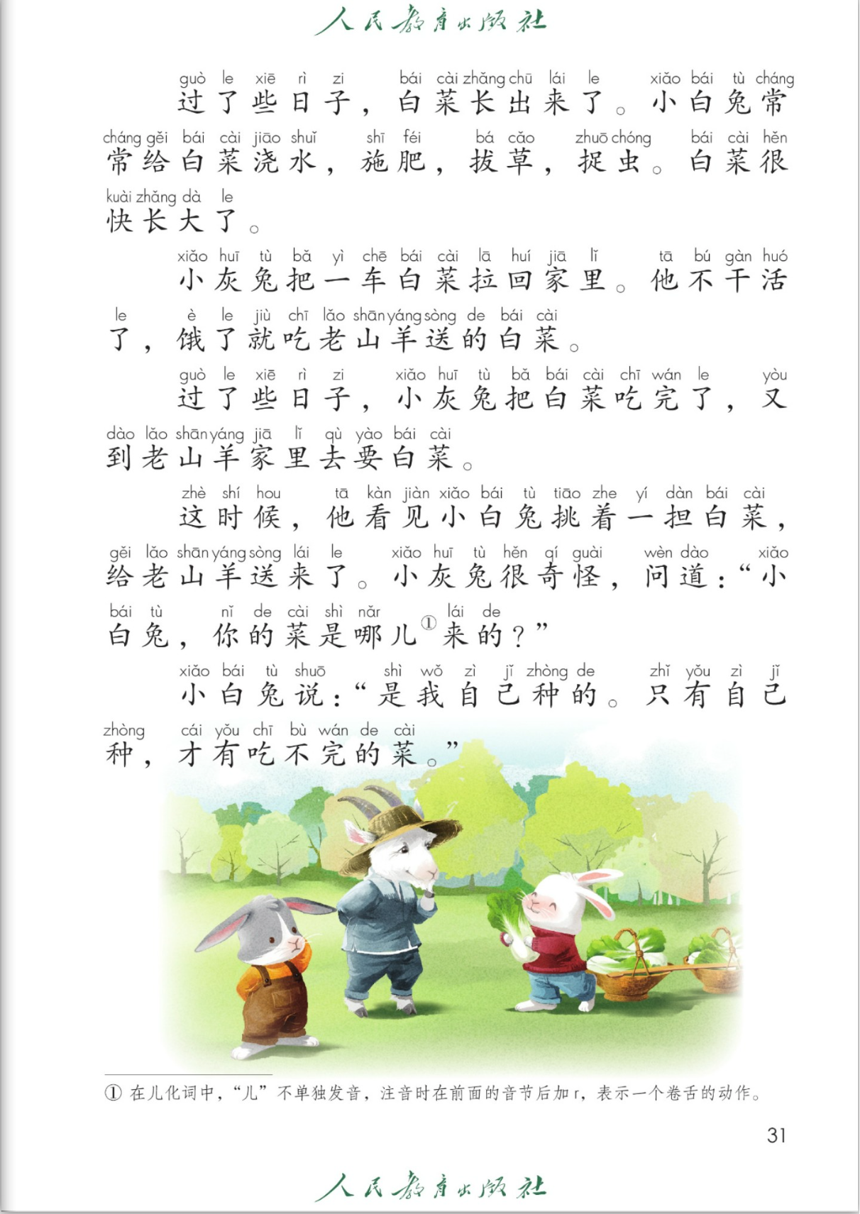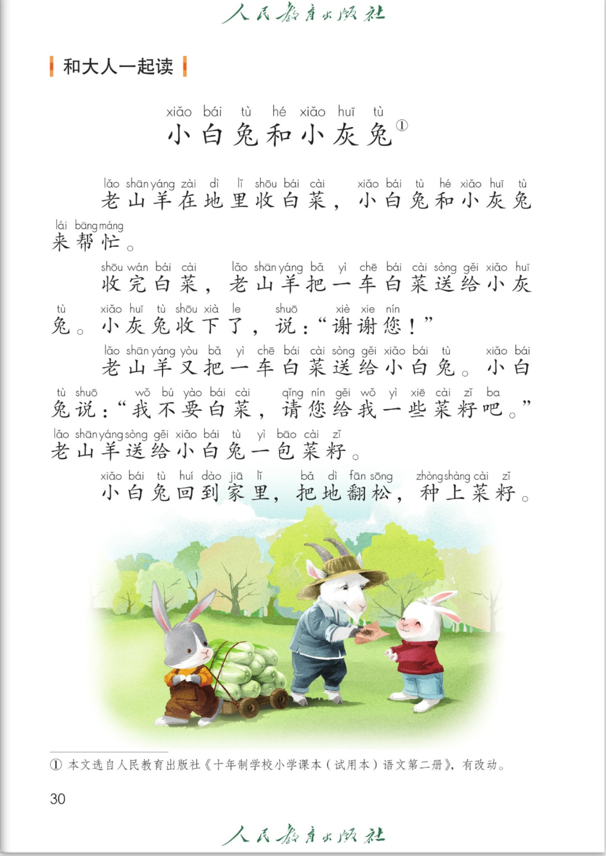 这也是几十年没变过的小学一年级课文了,可是现实生活是:因为小白兔擅长巴结领导,老山羊把一车白菜和白菜籽都给了小白兔,回到家后,小白兔雇小灰兔给他干苦工种白菜,然后每月给他一棵白菜,几个月以后,小灰兔起早贪黑、辛辛苦苦才获得了几棵白菜,小白兔一点活没干,收获了一田地白菜。